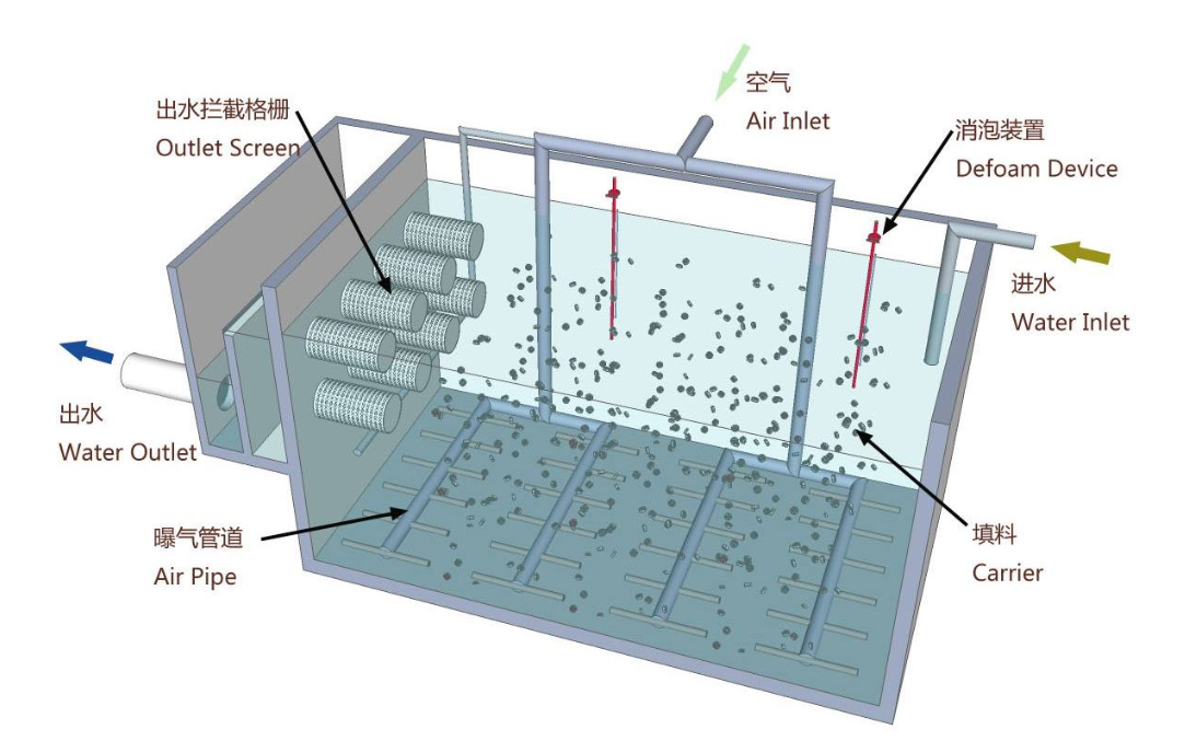 MBBR工藝是移動床生物膜工藝(Moving Bed Biofilm Reactor ,簡稱MBBR),該工藝兼具傳統(tǒng)流化床和生物接觸氧化法兩者的優(yōu)點,通過向反應(yīng)器中投加一定數(shù)量的適合微生物生長的懸浮載體,以提高反應(yīng)器中的生物量及生物種類,從而提高反應(yīng)器的處理效率。其填料載體密度接近于水,在曝氣時與污水呈完全混合狀態(tài),微生物生長的環(huán)境為氣、液、固三相,載體在水中的碰撞和剪切作用使空氣氣泡更加細(xì)小,增加了氧氣的利用率。每個載體內(nèi)外均具有不同的生物種類附著,內(nèi)部生長厭氧菌或兼氧菌,外部為好氧菌,這樣每個載體都成為一個微型反應(yīng)器,使硝化反應(yīng)和反硝化反應(yīng)同時存在,從而提高處理效果。